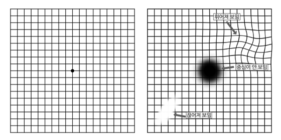 사물이 찌그러져 보이는 변시증이나 시야의 중심 부분이 까맣게 보이는 중심암점 등의 자각 증상이 있으면 안과에 오셔서 검진을 받아주셔야 합니다.