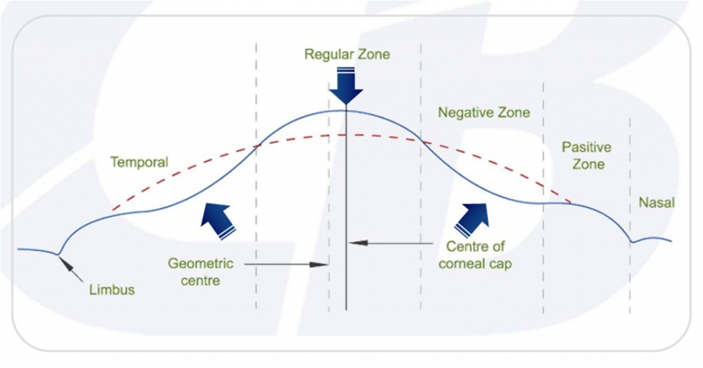 각막을 눌러서 편평하게 하는 것이 근시 진행을 억제하는 원리라고 생각하시는 분들이 많지만, 사실은 그렇지 않습니다. 우선, 드림렌즈는 각막의 가운데 부분을 눌러주면서도 주변 부분은 위로 솟아오르게 하는 ‘구형화’ 과정을 거칩니다.