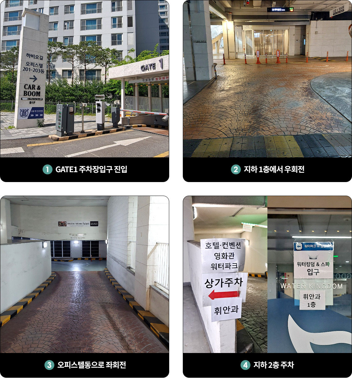 파크하비오 GATE1 주차장입구 진입 지하 1층에서 우회전, 오피스텔 동으로 좌회전, 지하 2층 주차 |